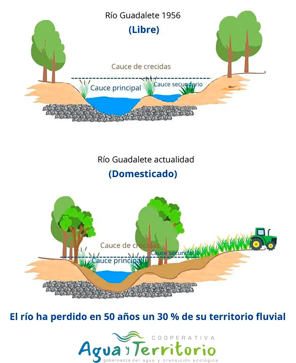 Por último, adaptarnos a las inundaciones forma parte también del proceso de recuperación y restauración del Guadalete, el río que vertebra el territorio de la campiña. Uno de los principales problemas que presenta actualmente el río es la profunda transformación de su cauce y de su bosque de ribera. El cauce ha sufrido un proceso progresivo de colmatación por sedimentos, cuyo origen se encuentra, fundamentalmente, en la aportación masiva de materiales procedentes de las zonas agrícolas de la cuenca. A lo largo de las últimas seis décadas, estos procesos han favorecido la acumulación de sedimentos y el desarrollo desordenado de vegetación, reduciendo la capacidad hidráulica del río y alterando su funcionamiento natural. Restaurar el Guadalete, devolviéndole espacio fluvial y recuperando un bosque de ribera funcional, constituye una medida clave para amortiguar el impacto de las inundaciones y avanzar hacia un territorio más resiliente. No hay territorio sin río ni río sin territorio.