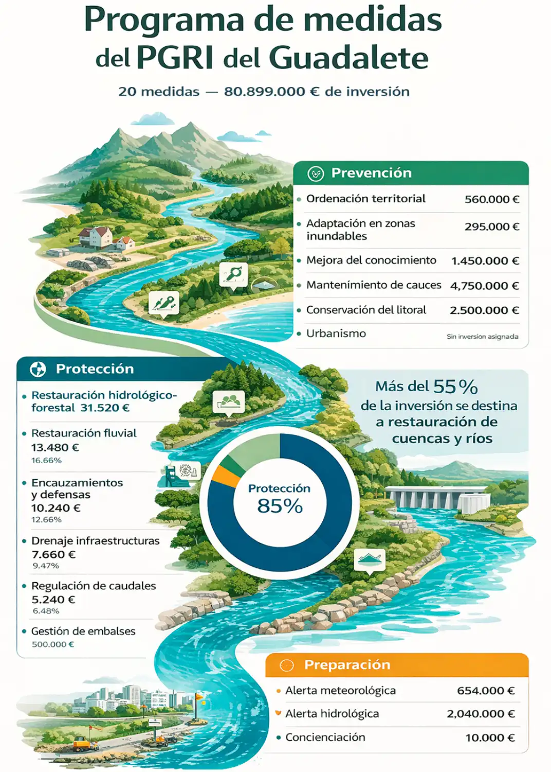 El PGRI contempla un conjunto de 20 medidas de prevención, protección, preparación y recuperación que suponen una inversión próxima a los 81 millones de euros. El grueso de estas inversiones se concentra en actuaciones de protección, especialmente en la restauración hidrológico-forestal de cuencas (31,5 millones de euros), la restauración fluvial (13,4 millones) y las obras de defensa frente a inundaciones (10 millones). Se trata, en conjunto, de un programa ambicioso y bien orientado desde el punto de vista técnico. Sin embargo, echamos en falta una mayor apuesta por la sensibilización, la comunicación y la divulgación de la problemática asociada a las inundaciones, cuestiones que son y serán clave en el actual escenario de cambio climático.
