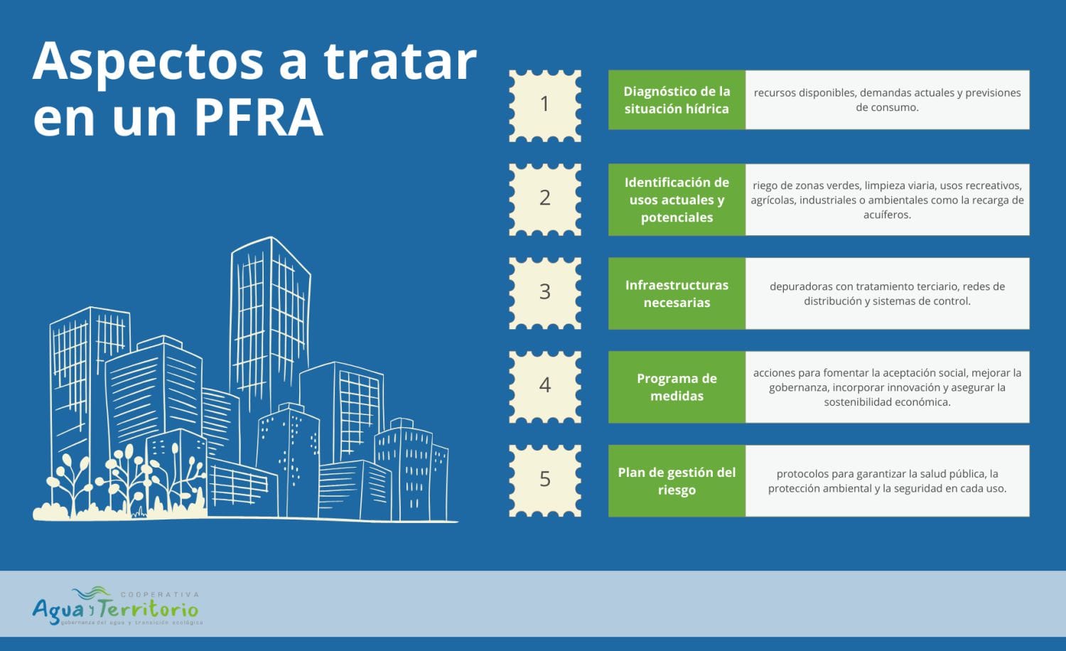 * Real Decreto 1085/2024, que aprueba el Reglamento de Reutilización del Agua. Su Capítulo VI obliga a los municipios de más de 50.000 habitantes a elaborar un PFRA con objetivos, diagnósticos y medidas concretas.